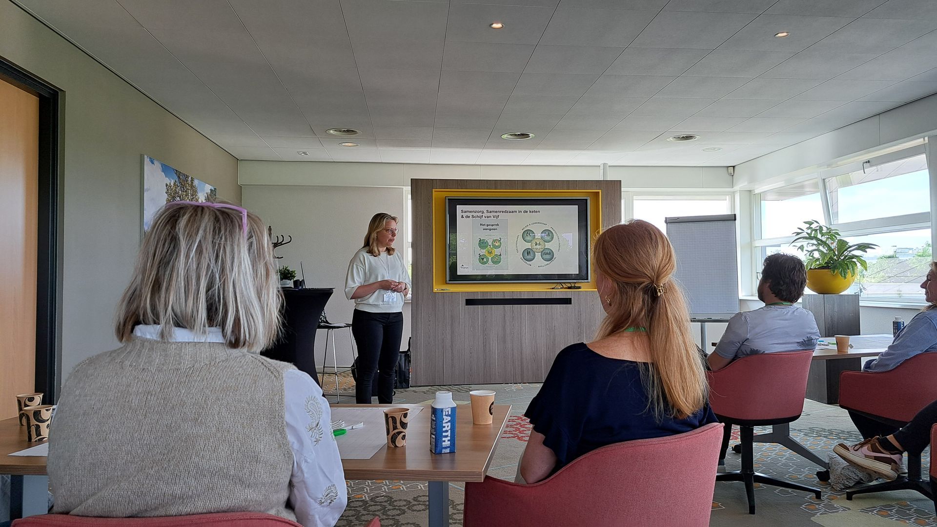 In het eerste deel van de bijeenkomst 'Samen aan de slag met de zorg van de toekomst' nam Fontys ons mee in de eerste resultaten van het onderzoek naar (zorg)Teams van de toekomst in de vorm van een narratief. Wat gebeurt er als we deze integreren in het dagelijks werk van zorgteams? En wat is er nodig om de Schijf van vijf voor samenredzaamheid te implementeren? In workshops gingen we hier met elkaar mee aan de slag. Dit leverde waardevolle inzichten op over de kansen én uitdagingen van anders organiseren in de zorg. Het was bijzonder om te ervaren hoeveel energie er ontstaat wanneer het werkveld en het onderwijs elkaar echt ontmoeten.