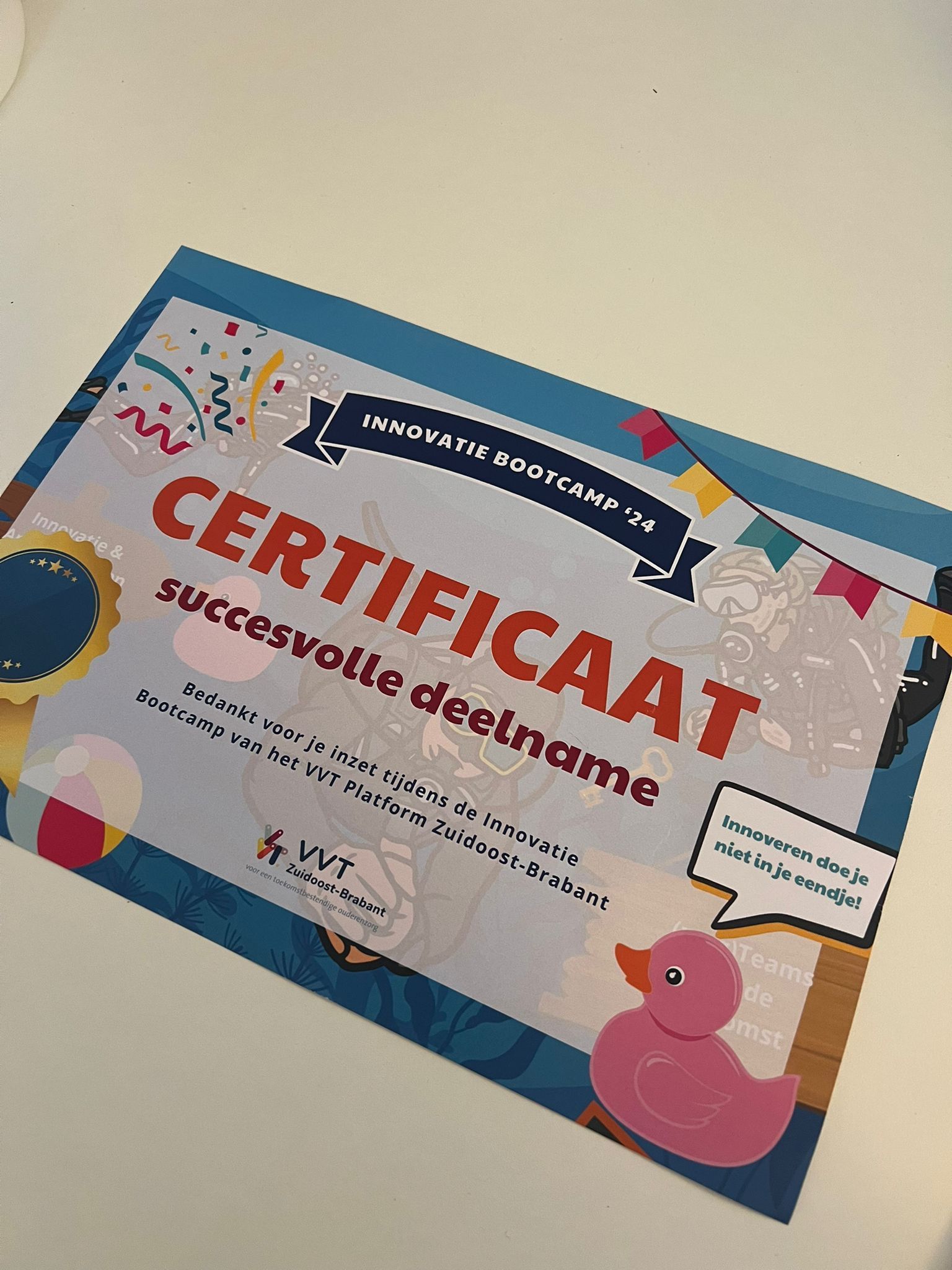 De dag werd feestelijk afgesloten met een gezellige netwerkborrel, met ruimte om na te praten en te netwerken. Bij het vertrek lag er voor alle deelnemers een certificaat klaar als beloning voor de deelname. Vol inspiratie, energie en ideeën rondden we de bootcamp af, klaar om met de ideeën aan de slag te gaan!