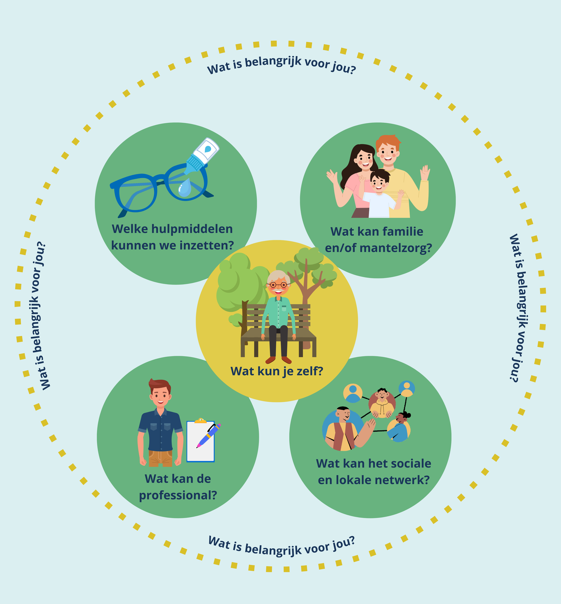 Samenredzaamheid betekent vertrekken vanuit wat voor cliënten belangrijk is en samen met naasten, het sociale netwerk, hulpmiddelen en professionals invulling te geven aan kwaliteit van leven. De Schijf van vijf ondersteunt dit als praktisch gespreksmodel en helpt om met elkaar het goede gesprek te voeren over zorg en ondersteuning. Door op een andere manier naar zorg en ondersteuning te kijken, versterken we de eigen regie en zelfstandigheid van mensen en verlagen we samen de werkdruk binnen de zorg.